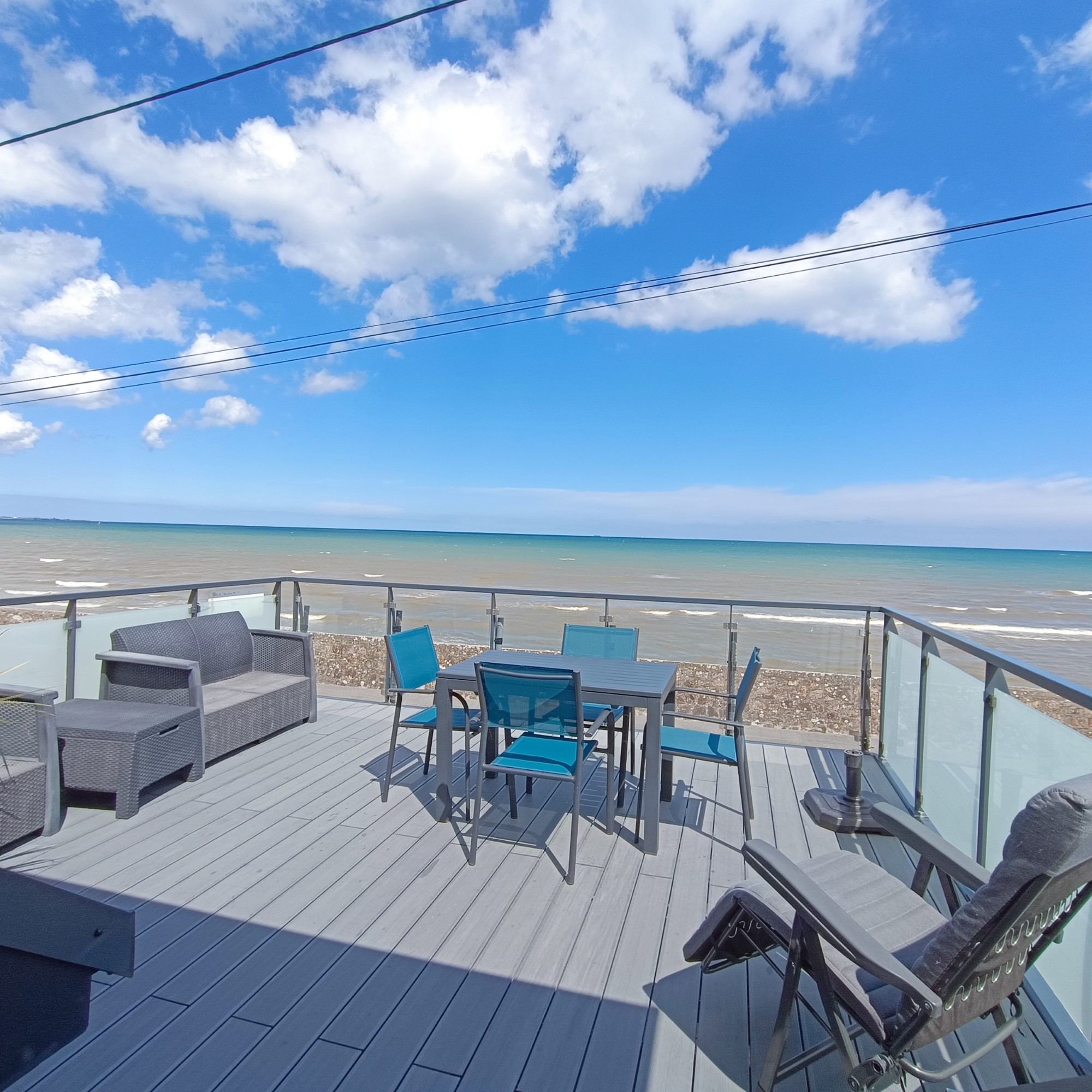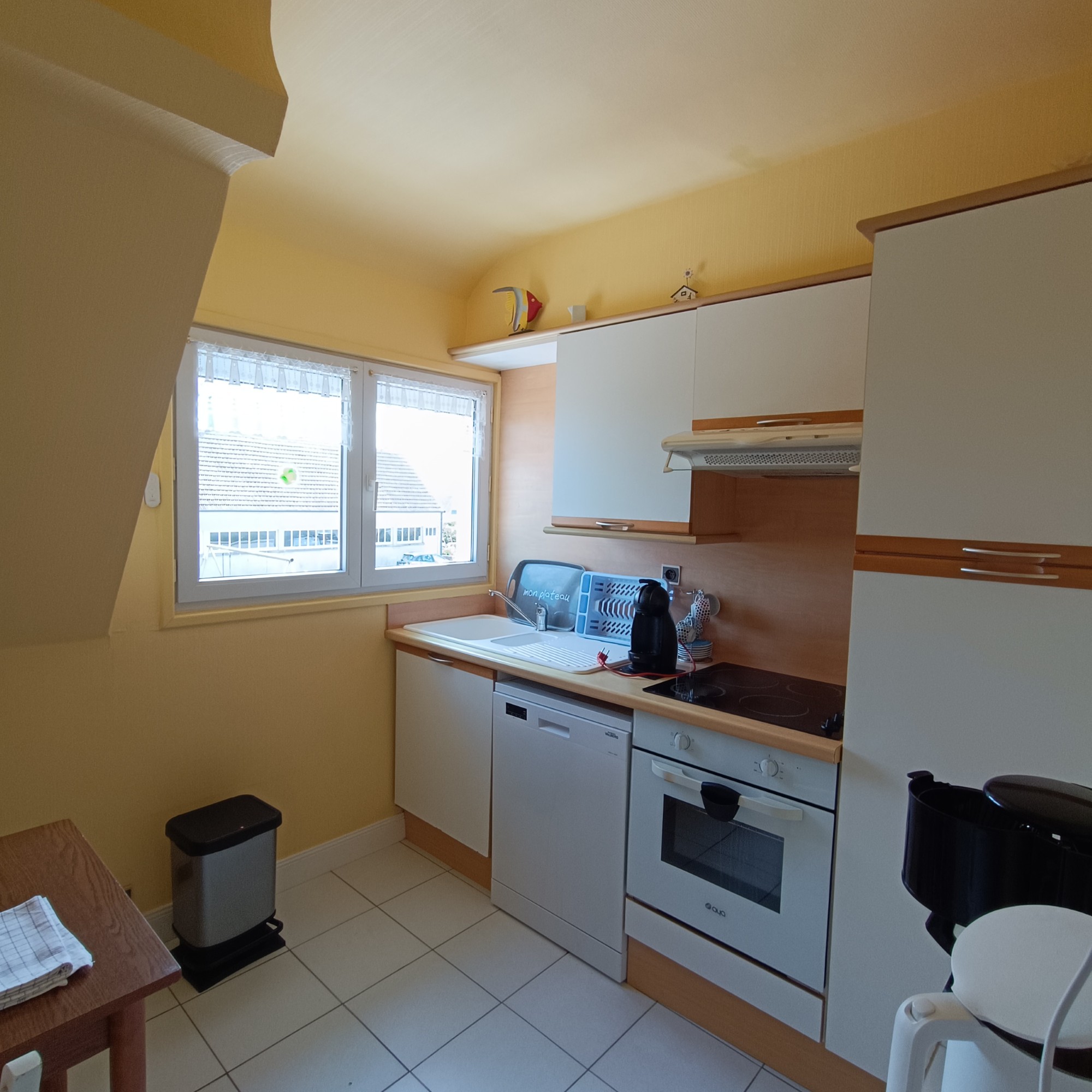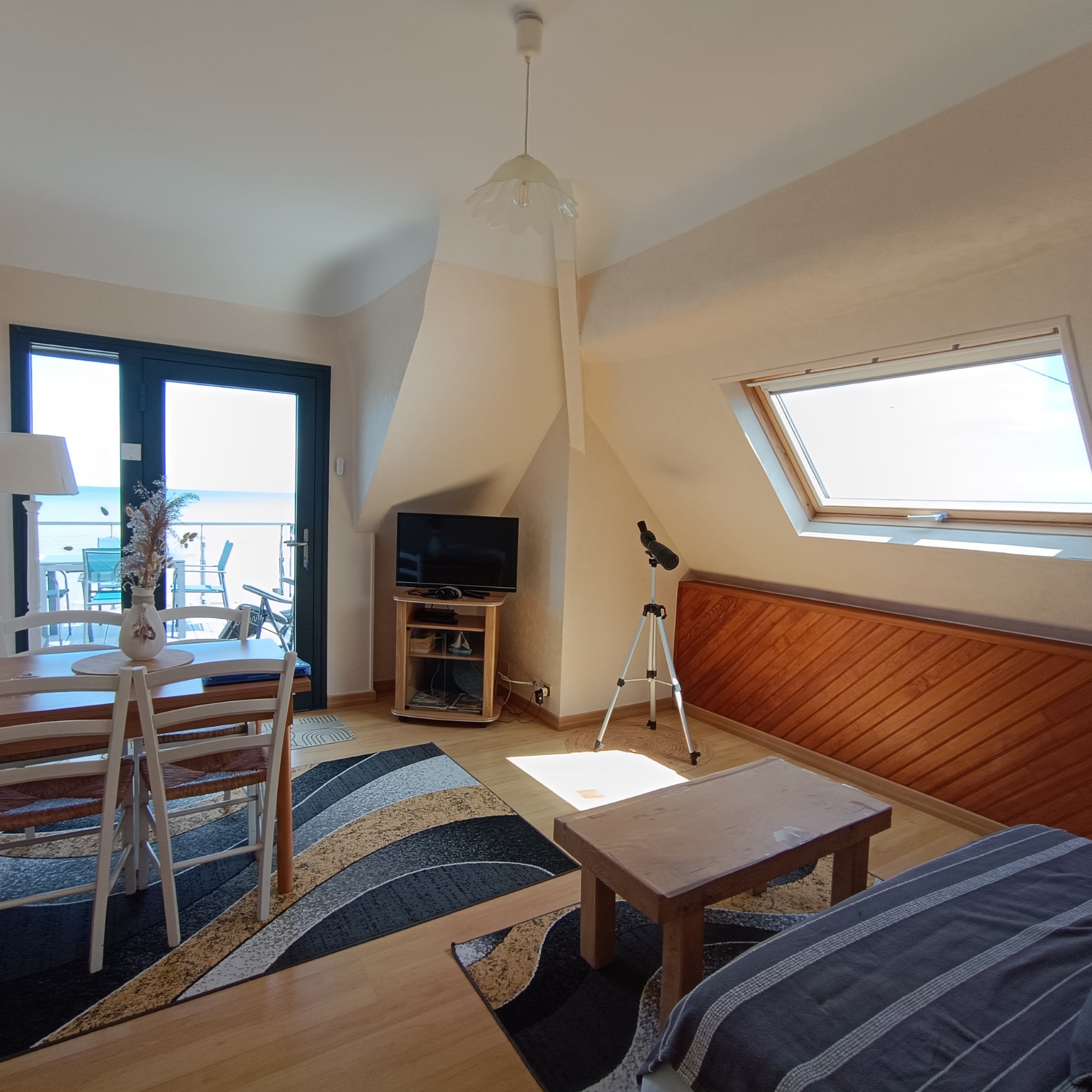 Appartement tout confort au 1er étage avec 1 séjour, 1 cuisine équipée, 1 chambre et 1 salle de bain avec WC. Magnifique vue sur toute la côte Est du Cotentin (de Tatihou à la pointe du Hoc) sur une magnifique terrasse de 20 m² surplombant la mer.
